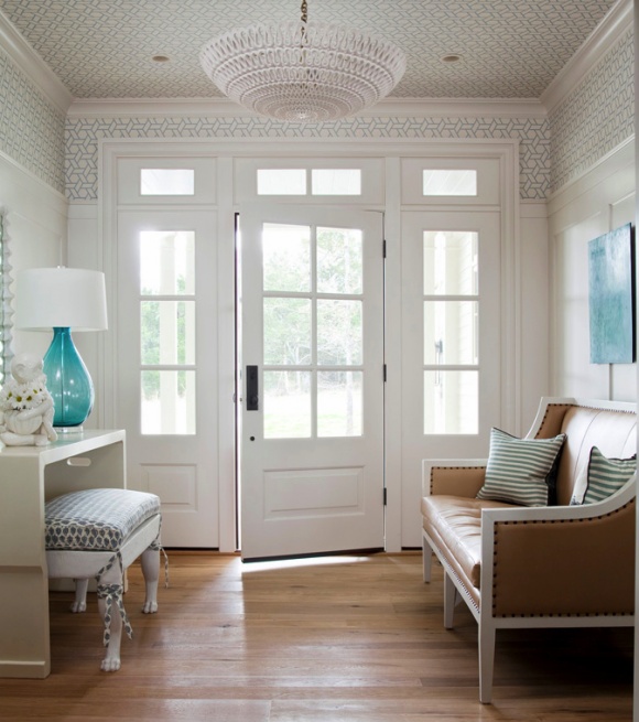A tray or framed-out ceiling is ideal for paper, especially if you just want a little bit of texture and pattern – this one adds texture, glamour and highlights the fantastic gilded sunburst.I love wallpaper in a nursery or children’s room! There are so many fun patterns out available and a pattern really helps cozy up the space and add a touch of unexpected fun. This room was done AE Design.Great color scheme and fun wallpaper on the ceiling add some playfulness to very formal architecture. Interiors by Carla Aston.Lovely architecture and color scheme – the entry is pulled together by the wallpapered ceiling.I love this silver leaf paper in a fairly traditional dining room – a bit of glamour for a New England style room!Here’s a really fun, young look showing how to mix wallpaper on the walls with a different paper on the ceiling – this is from the Kips Bay Showhouse 2010 by Eve Robinson.A warm and bright nursery with grasscloth walls and starry wallpaper on the ceiling.