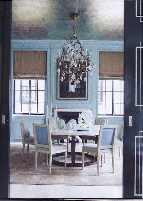 I recently had the great pleasure of assisting the super talented and very charming designer Elizabeth Hourihan of EBH Interiors based out of Connecticut on a photo shoot. One of many things that I found myself inspired by was her use of wallpaper on the ceiling. It doesn’t have to be something that looks model homey (my rap name) or even kooky – it can be subtle and sophisticated. I’m including some images to inspire you to think about how this could potentially work in your own home. It is an especially easy way to add some glamour to a dining room or a powder room.