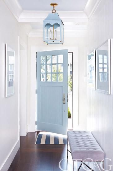 Here’s my tiny, very unfinished entry with a Moravian star lantern – I’m considering a red to match the art…too much? I was going to put wallpaper here until I hung the star lantern up and realized how much pattern it throws! There’s a lot of little finish work still to do in this small room and the photo is awkward because I had to fend off the dog when I was crouched down at the door taking the shot. Good times.This is a great entry space made a little more interesting with the mustard/gold ceiling. I like the bright white and the dark iron with the bold color although, the more I look at this, the more I think the color might be photoshopped in…the accessories are also super generic. Still. It’s an interesting color and it works! (Source)Southern porches are traditionally painted a pale sky blue – I love bringing this porch color inside. It’s a great way to transition from inside to outside. If you need a front door color think about matching your front door to your ceiling. It doesn’t need to be the same color – just go one up or one down on the color chart. (Source)Here’s another very pretty sky blue ceiling and door. Notice how the walls are kept white in all of these schemes. (Source)Starbursts and stripes aren’t just for children’s rooms – they work great in a small entry way with little to no architectural interest. (Source)