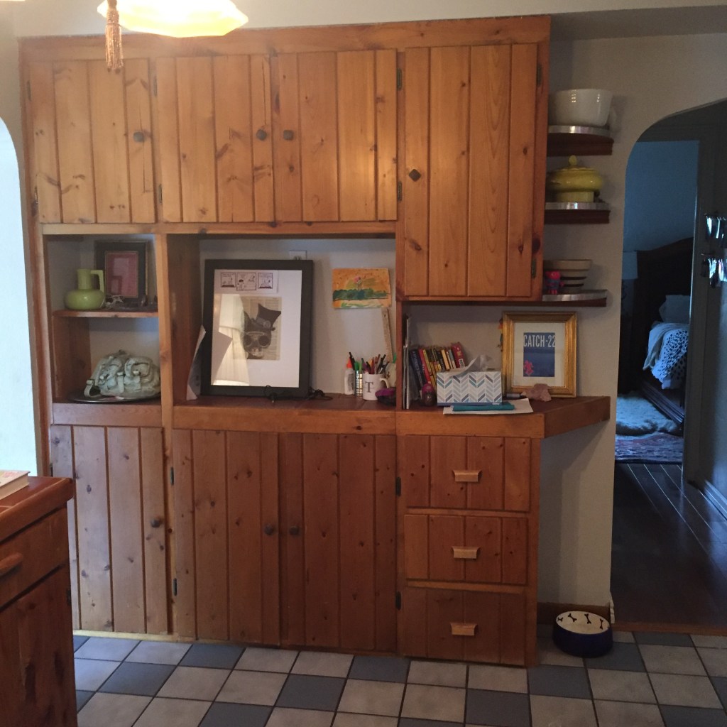 I never took any before photos of the kitchen in the 1930’s house we have now, except for this one corner  It’s a small, dark kitchen that, according to my mom, feels like a dead end.  It’s 1960’s pine cabinetry with one small window.  It’s a tile floor that reminds me of an auto parts store and don’t get me started on the tile countertop.