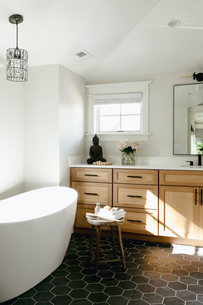 The floor is natural slate in a hexagon. The cabinets are white oak.