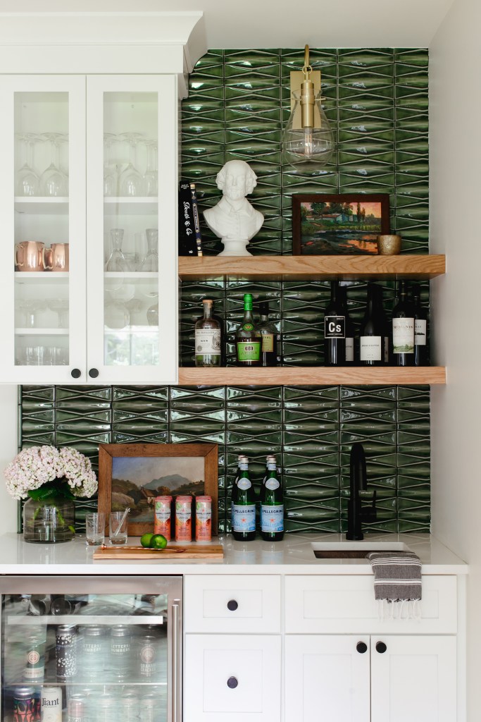 We used white cabinetry as a simple backdrop to the gorgeous green tile (Called “Baroque” by Soho Studio – purchased locally at The Floor Club). The clients under-counter refrigerator is filled with craft beer and they enjoy making complicated cocktails. A bust of Shakespeare presides over the action.