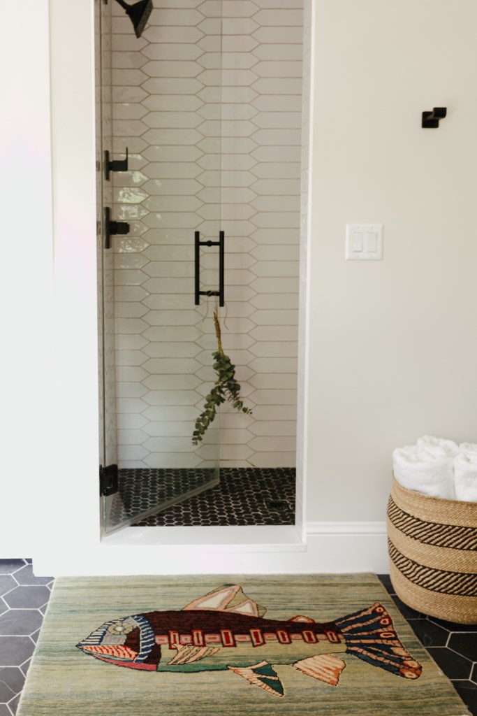 The picket tile in the shower picks up the geometry on the floor. We used a smaller slate hex on the shower floor. This cute fish rug is from Shaver Ramsey – they have quite a few in different colors and we all fell in love with it.