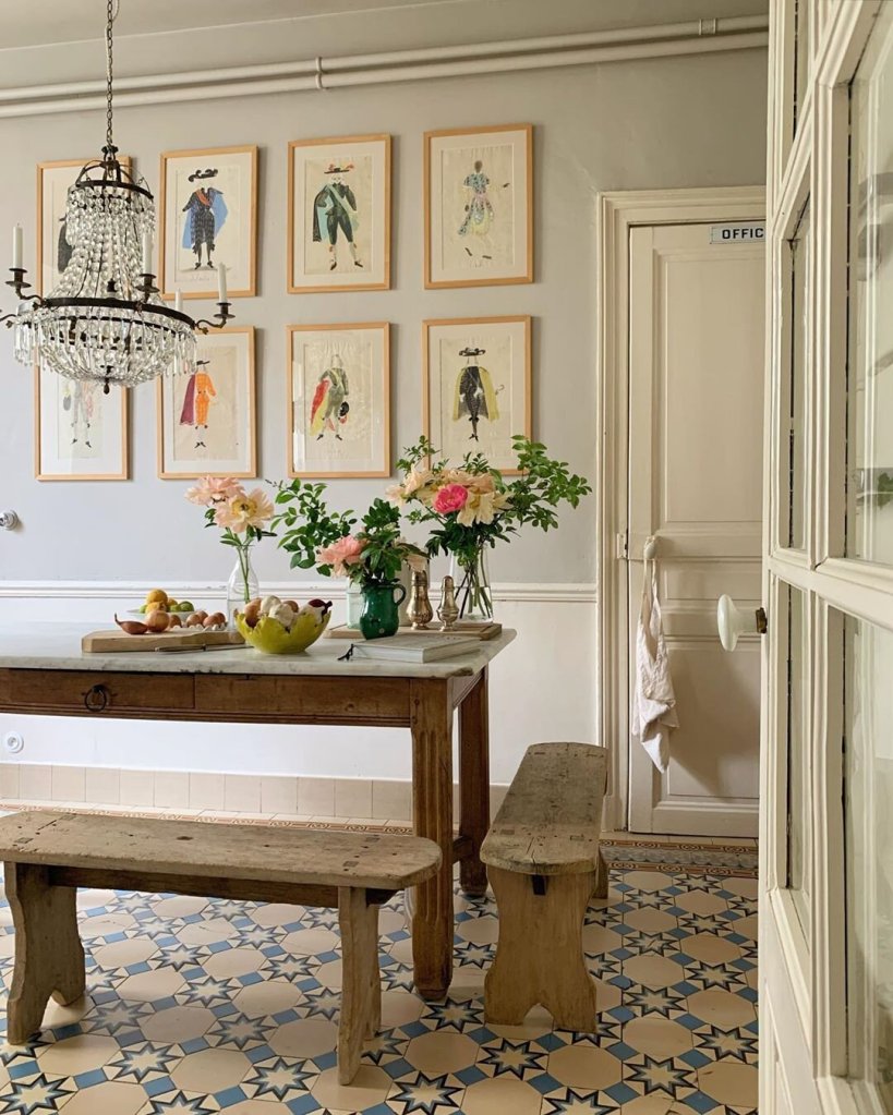 This table is in a kitchen and I like the European style of having a table instead of a big island. It may not be as practical, but it’s very chic! I wish I had room in my kitchen for one. I would sit too long at it and dinner would be late every night. (Photo Source)