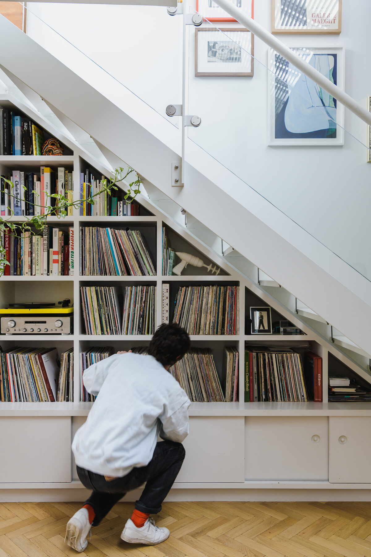 I like this modern and simple record storage tucked under the stairs. It looks great contrasted with the older herringbone floors. (Source)