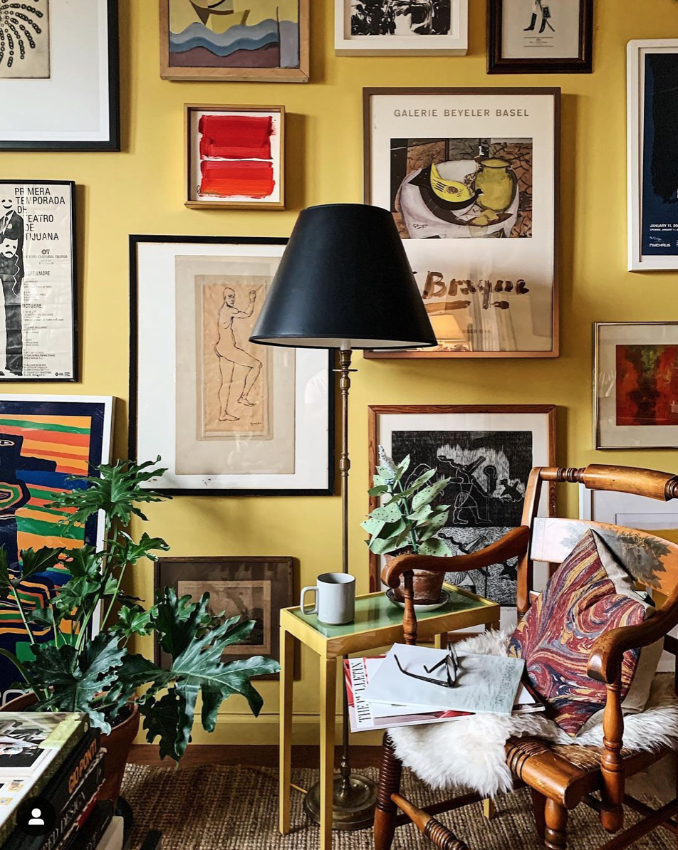 I adore this mustard yellow wall behind the layers of fun art. This is from a favorite Instagram account I follow “A Spoonful of Benjamin” His apartment looked good before he went yellow on the wall but now it really sings. (Photo Source)