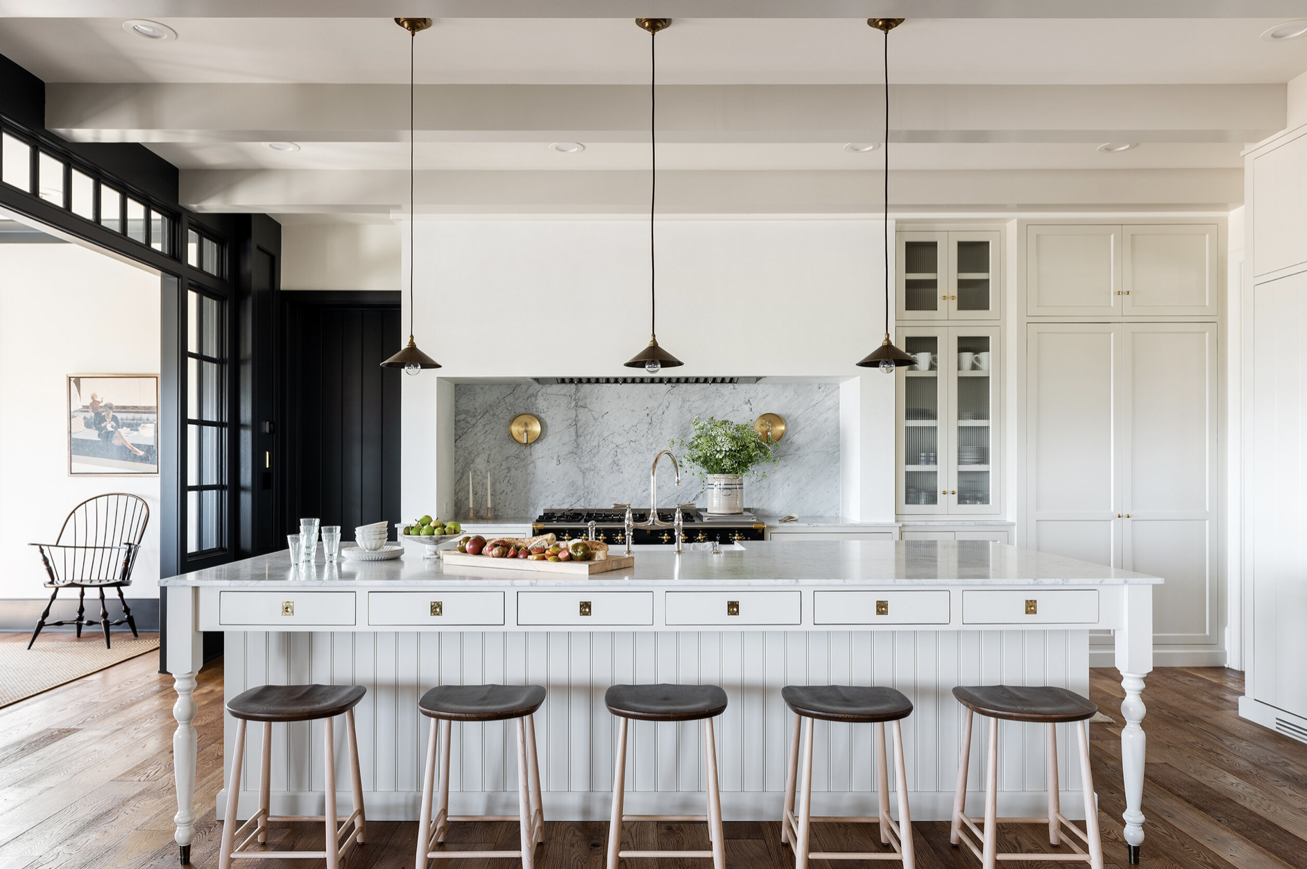 The island! I love the drawers and the cute turned legs with metal sabots. I’ve also been designing a few hoods like this with drywall or brick coming down on each side. I think that this white kitchen is made more interesting by the dark interior glazing on the left and I’m liking the warm, rustic brown floors.
