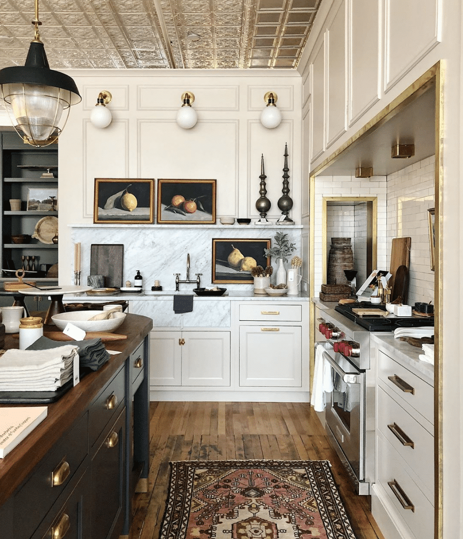 Old floors, a mix of brasses, a mix of countertops and an almost crazy amount of “things” laid out – I love it. I love minimalism, but when I try to do it in my own home, the empty walls and floors call to me to fill it with vintage rugs, vintage art and more plants. This is a Jean Stoffer kitchen which I’ve seen styled a few different ways. Either way you style it, Jean is just the best.