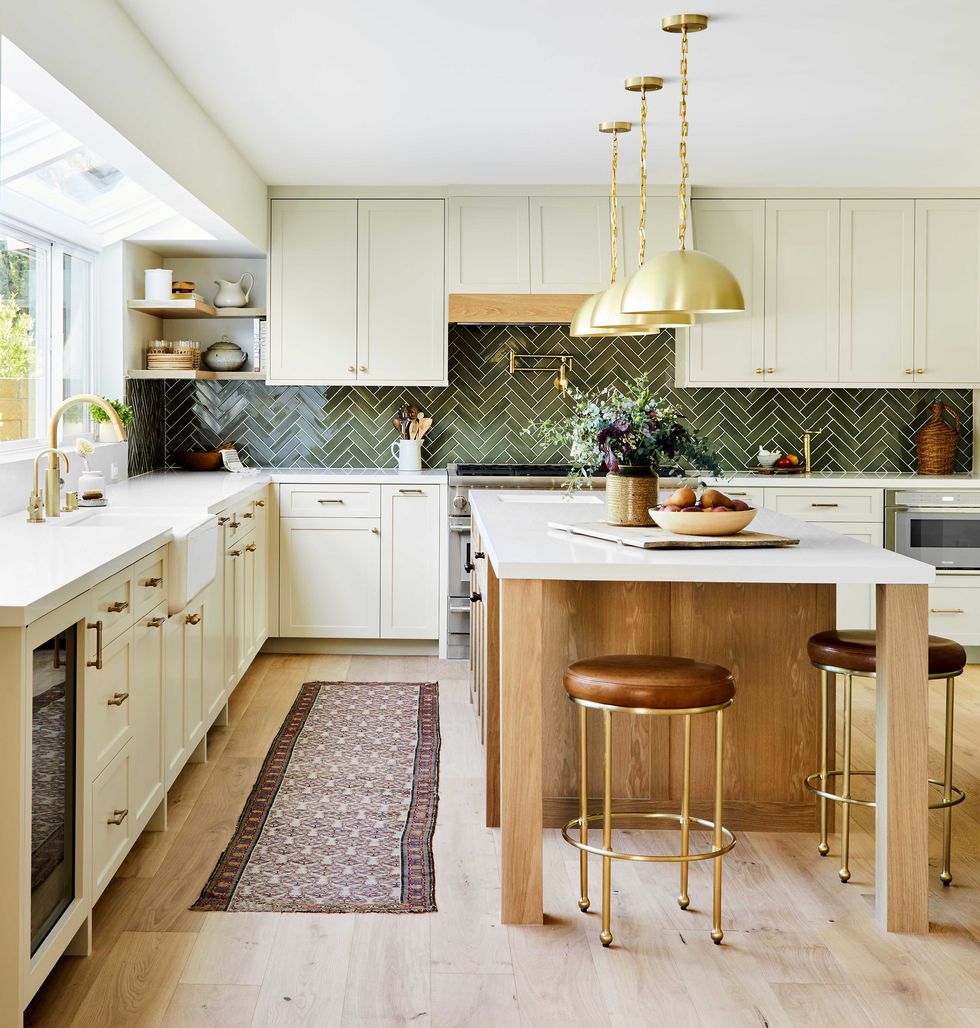 Colorful backsplashes are making a comeback! I’m excited for color in the backsplash after years of white and gray only. I recently put a beautiful blue/gray zellige tile in a white and wood kitchen and it really added some personality. You can keep the big pieces in the kitchen neutral and then add a pop with your tile. Also, notice the different brasses in this photo and then notice that it doesn’t matter at all for the overall feel of the room. Mixing woods and metals can create a more natural, relaxed vibe.