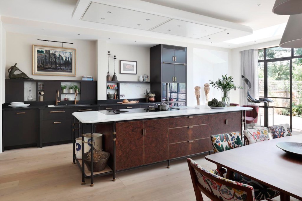 Here’s another kitchen with art, objects and other untraditional kitchen elements I love this island also. I don’t love the drywall piece above it – but maybe it’s concealing a vent.