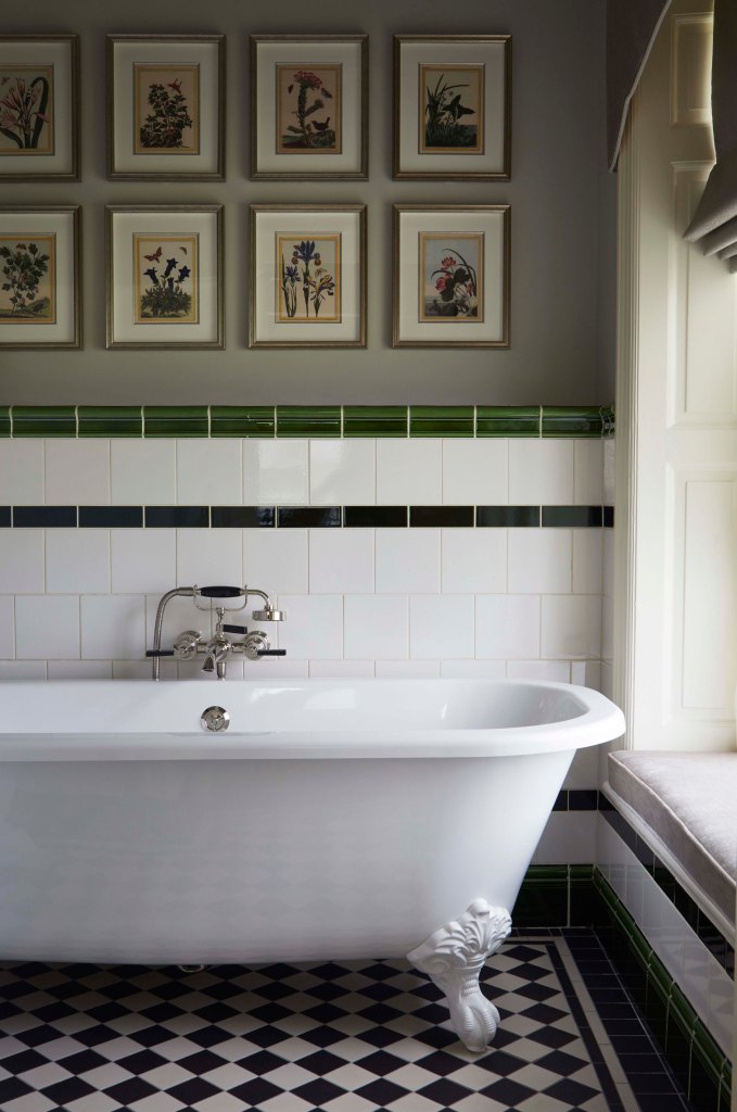 I love the green used just for the trim pieces only. What a fun, unexpected detail and it’s paired with the larger square tile. I really like the border on this checkerboard floor too.