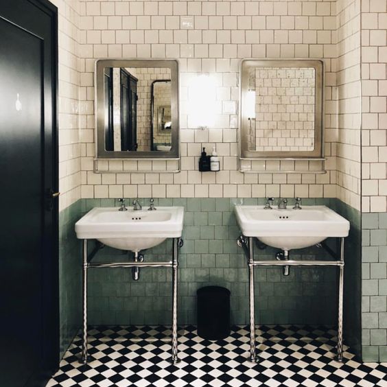 The photo above is a great example of how simple this look really is. Black and white tile in a cute check pattern for the floor and large format green tile for the walls. There’s nothing too precious or overly expensive here and it gets the design idea across.