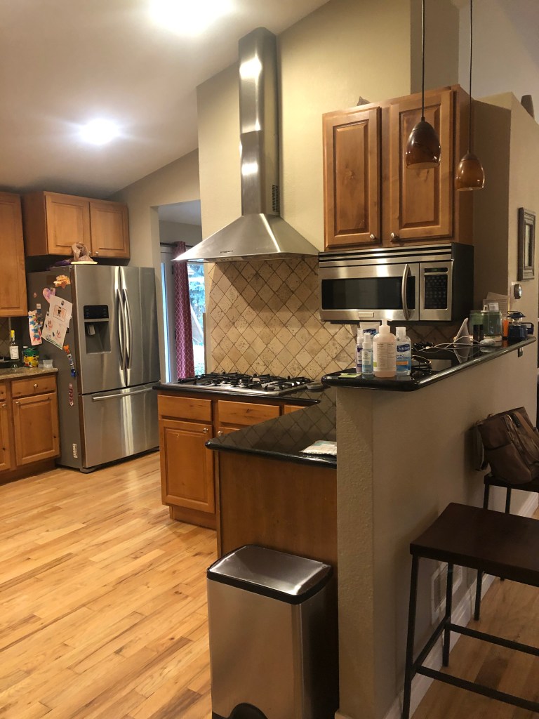 Here’s another view of the kitchen before the remodel. There was also a drywalled pantry that was not very functional for them as a family. We added pantry space in the form of multiple cabinets with roll-out shelves.