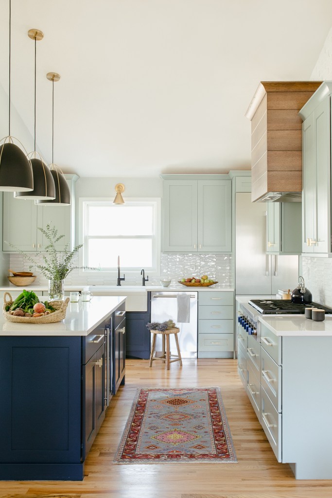 Out of view in the above photo are double ovens. The double ovens were delayed by about 6 months more than we were first told! The showroom loaned the clients a gold oven that got them through the holidays. The light fixtures were originally intended to be white and were packaged by the store in a box labeled white. When the client opened them to install – they were black. We decided to keep them! It’s a little untraditional with the blue island, but I think it looks a little less farmhouse-y with these.