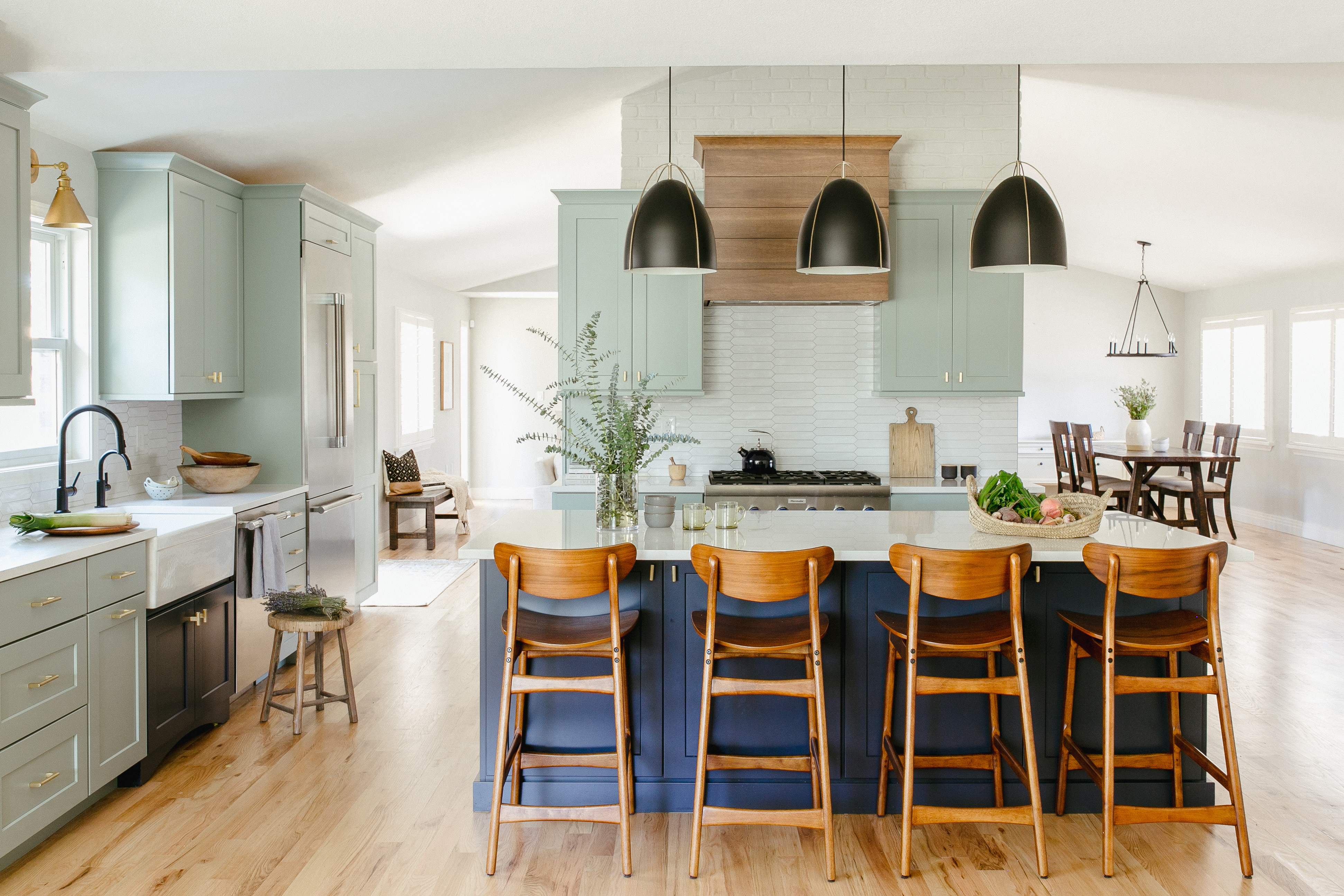 Out of view in the above photo are double ovens. The double ovens were delayed by about 6 months more than we were first told! The showroom loaned the clients a gold oven that got them through the holidays. The light fixtures were originally intended to be white and were packaged by the store in a box labeled white. When the client opened them to install – they were black. We decided to keep them! It’s a little untraditional with the blue island, but I think it looks a little less farmhouse-y with these.