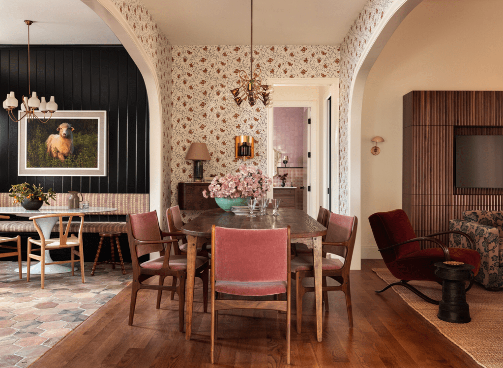 The wallpaper! The vintage furniture! The sheep art! This is such a target rich, textural and layered environment. The other rooms in this home are stunning.