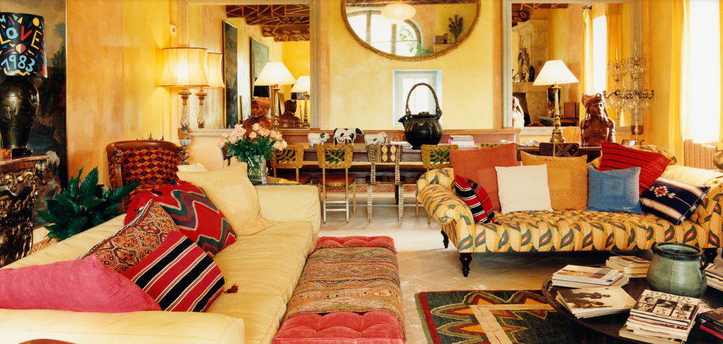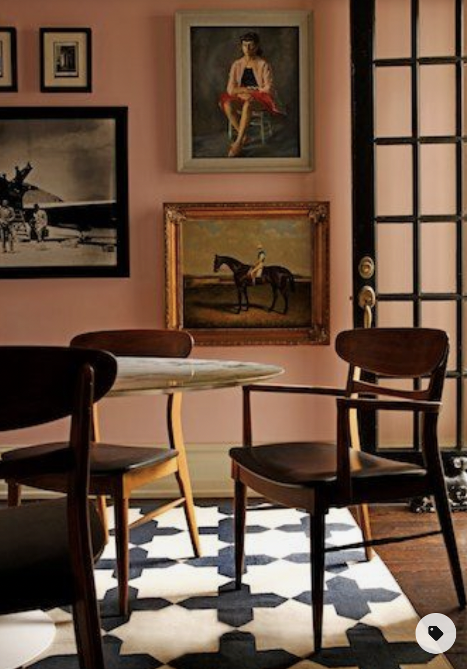 I know. Everyone’s tired of white kitchens and here I go again…I’m never tired of a farmhouse kitchen. This one would make such a good backdrop for a movie. (Photo Source)I like the exposed pipes, the old floorboards, the ancient impractical stove and the lack of anything super useful near it. For me this image is more about the photo than the room. (Photo Source)The eclectic fabrics and furniture, all the yellow, the old mirror – ahh. It wasn’t stylish for a long time to admit that you liked yellow. I like yellow. (Photo Source)The peachy walls. The casual hanging of the art. The black and white pattern. (Photo Source)