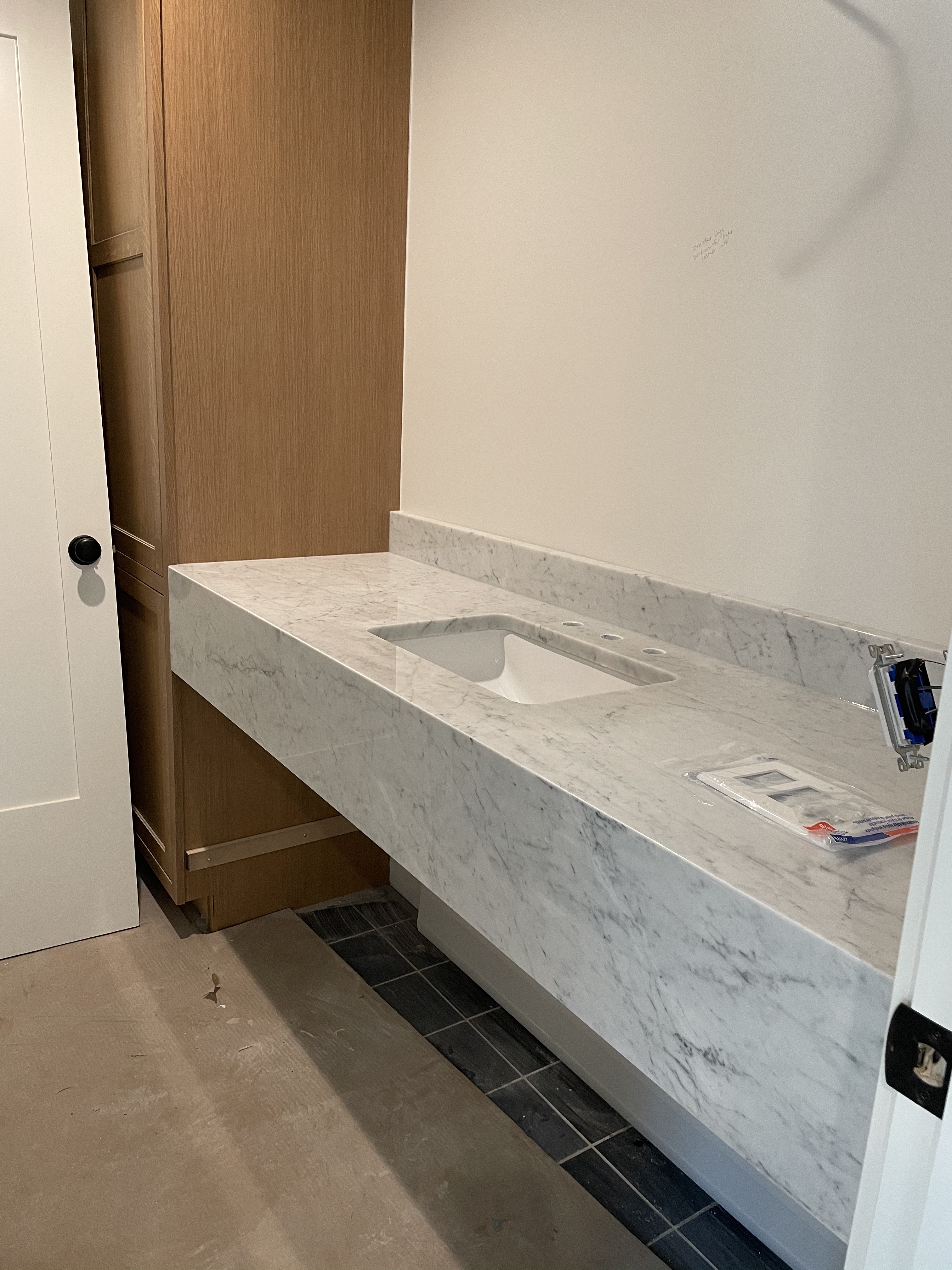 When you construct a “floating” marble or stone vanity there’s always 2×4’s and/or steel support underneath the stone. The stone fabricators miter the front edge of the stone so that it looks like a solid block. You will see the p-trap underneath countertops like this so make sure you order the coordinating metal p-trap cover if you don’t want to see PVC pipe.