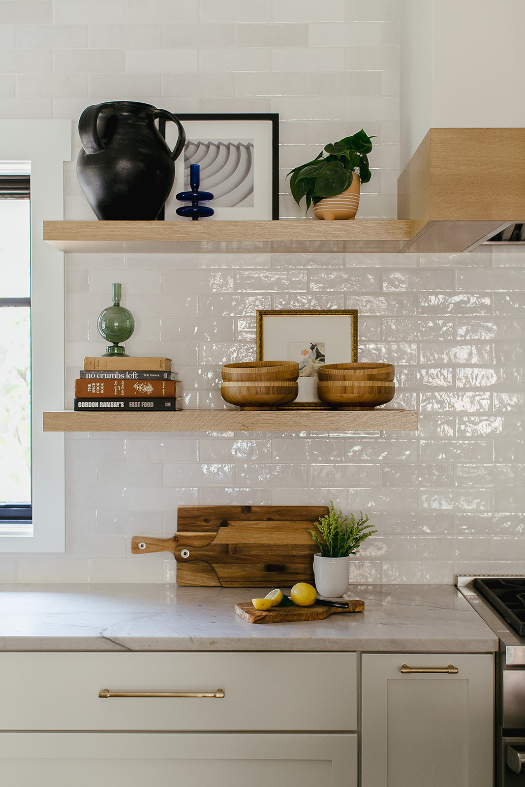 The client bought some “vintage” cookbooks from a used bookstore in town with an eye to the color of the spines. The floating shelves here are hollow. They have steel supports that are anchored to the wall studs and hidden around the box of the shelf. This requires some planning ahead but it’s a nice look for people who don’t want to see a wall bracket. These will hold a lot of weight.