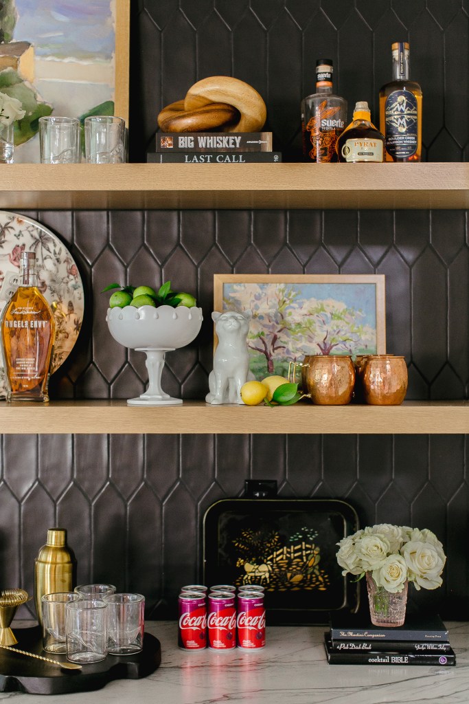 A dry bar is a home bar without a sink in case you’re wondering. I’ll have clients shoot me a panicked look when I mention “dry bar”, but it’s just indicating that there’s no sink. We added a little bit of drama to this bar with the black picket tile. I chose a black grout to keep it on the dark side.