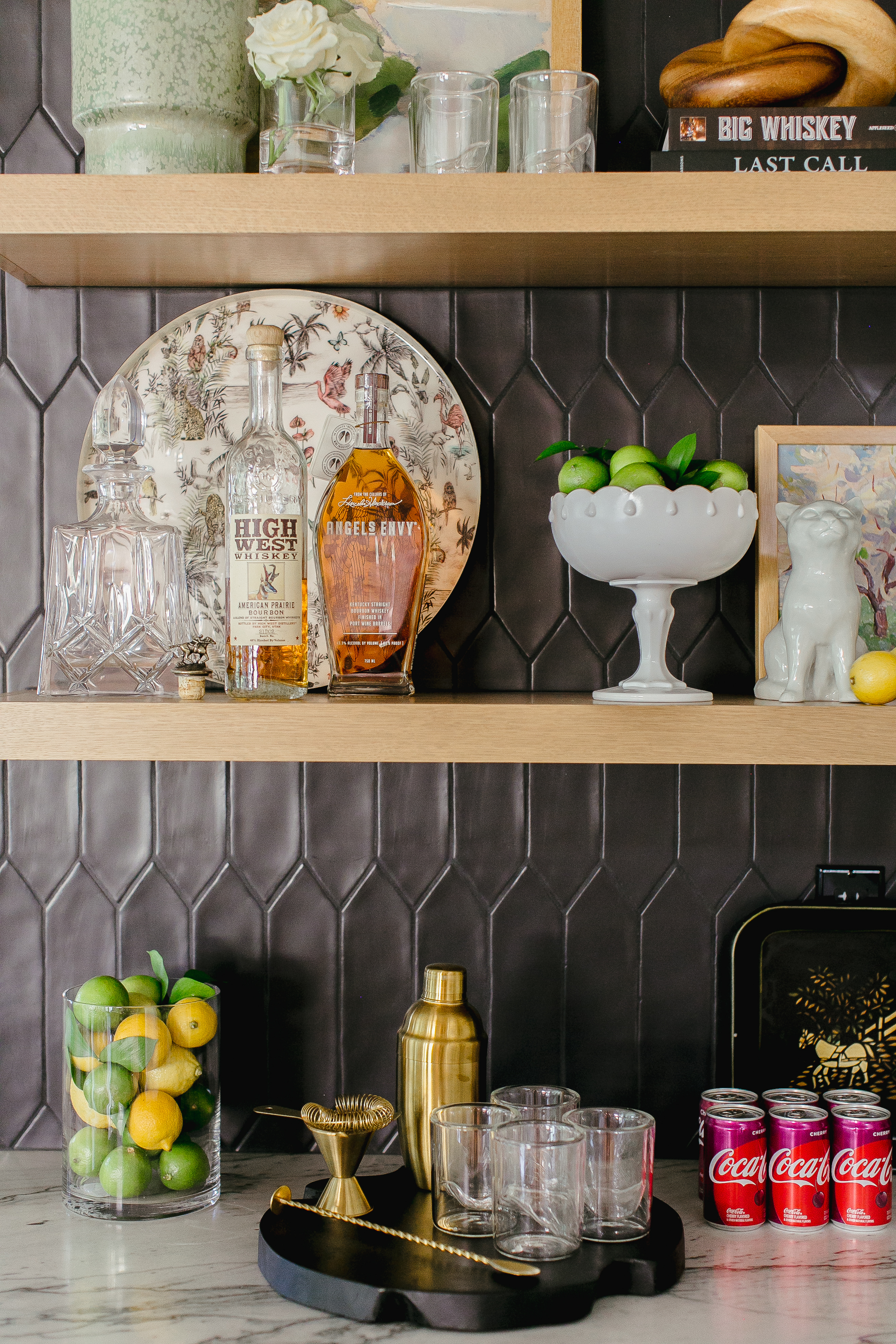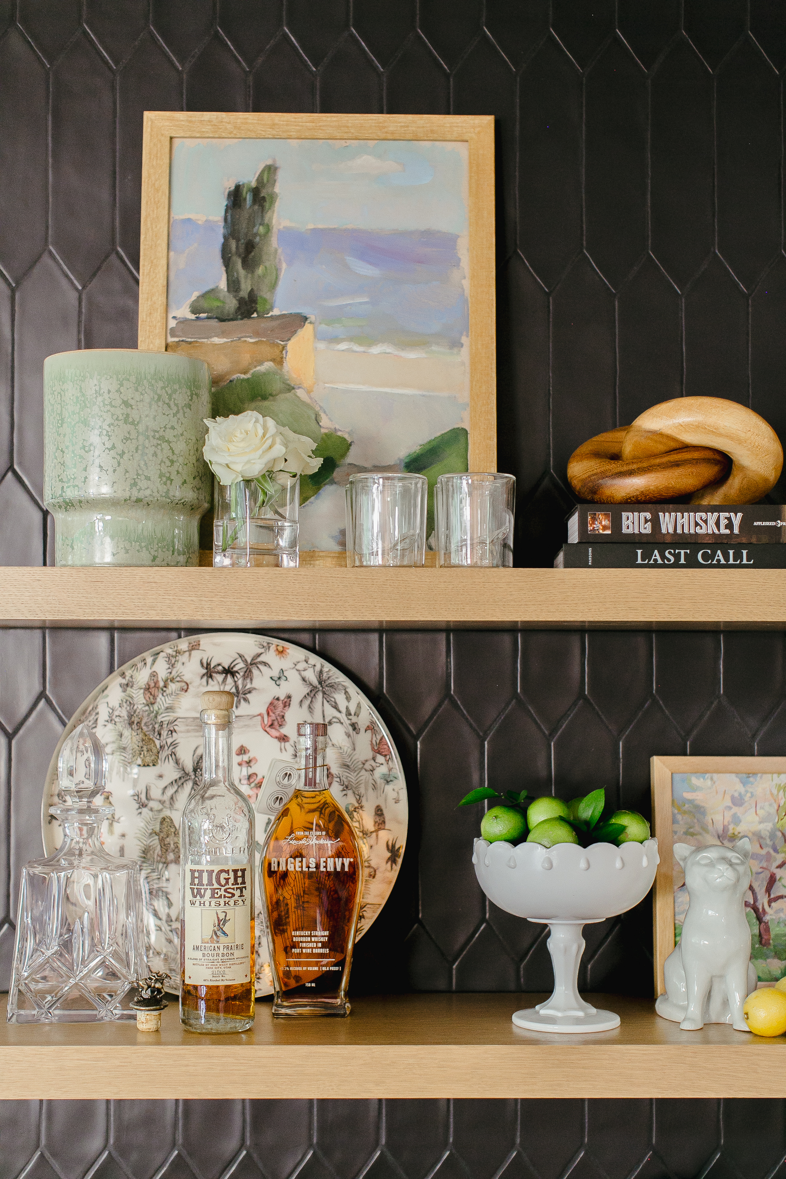 A dry bar is a home bar without a sink in case you’re wondering. I’ll have clients shoot me a panicked look when I mention “dry bar”, but it’s just indicating that there’s no sink. We added a little bit of drama to this bar with the black picket tile. I chose a black grout to keep it on the dark side.