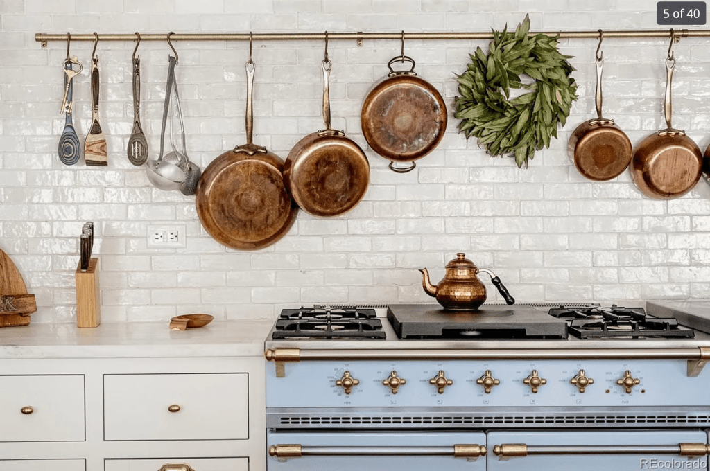 This caught my eye because A. it’s lovely and B. I’m designing a kitchen right now with a pot rack like this behind the stove. (Photo Source)