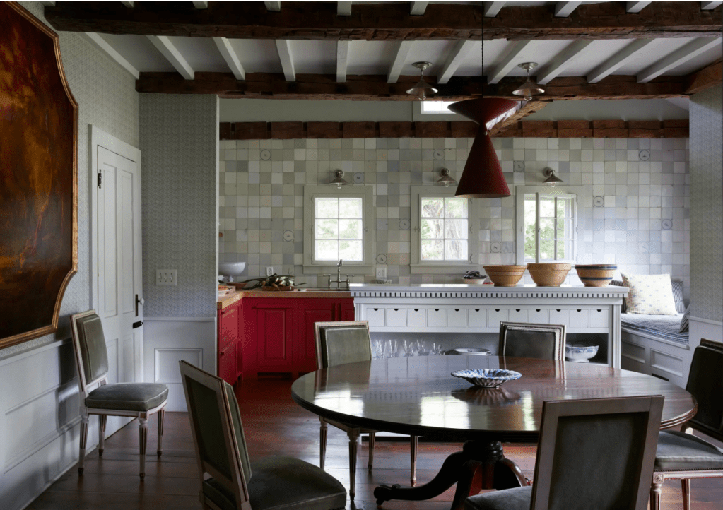 This only shows part of the kitchen, but what a ceiling and I love that stone wall. I also love the old wood floor – so good. (Photo Source)