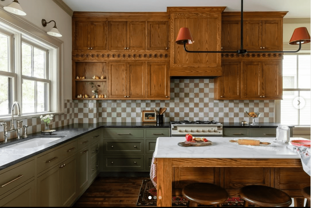 I love the green “skewed checkerboard splash”. So good. I also really love wood tone and green painted cabinets with brass hardware. I was not one of the cool kids, and didn’t really like them #sorrynotsorry Ha!