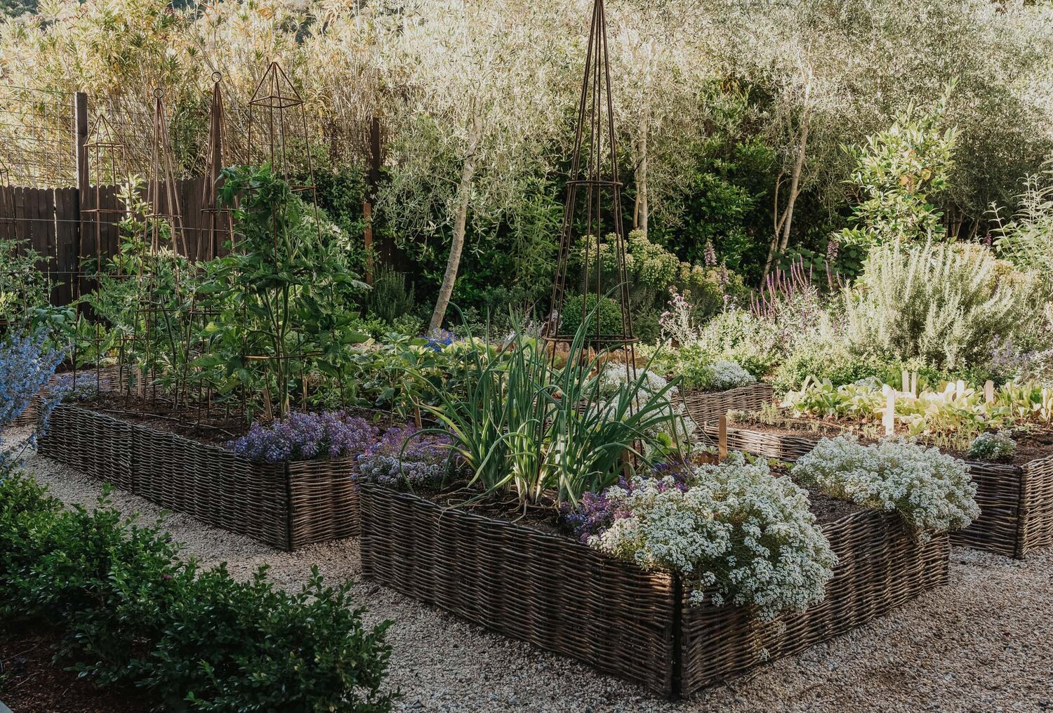 The wicker panels around the raised beds are stunning. (Photo Source)
